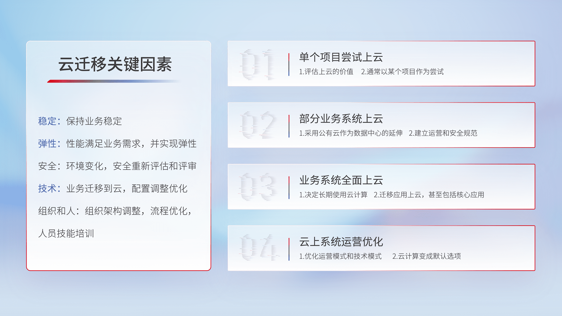 结合实际业务,,,,从规划设计、、云平台选型、、、云原生改造、、、、数据迁移、、集成交付,,,,迁移全过程为客户识别最佳上云路径,,做好风险识别管理,,,设计网络架构、、、、身份权限、、、、安全审计合规、、、、操作审计、、、日志审计、、监控告警策略、、、多站点容灾设计等,,,对云上基础设施进行整体规划,,,,提升IT治理水平,,,以满足弹性、、高可用、、高性能的需求。。