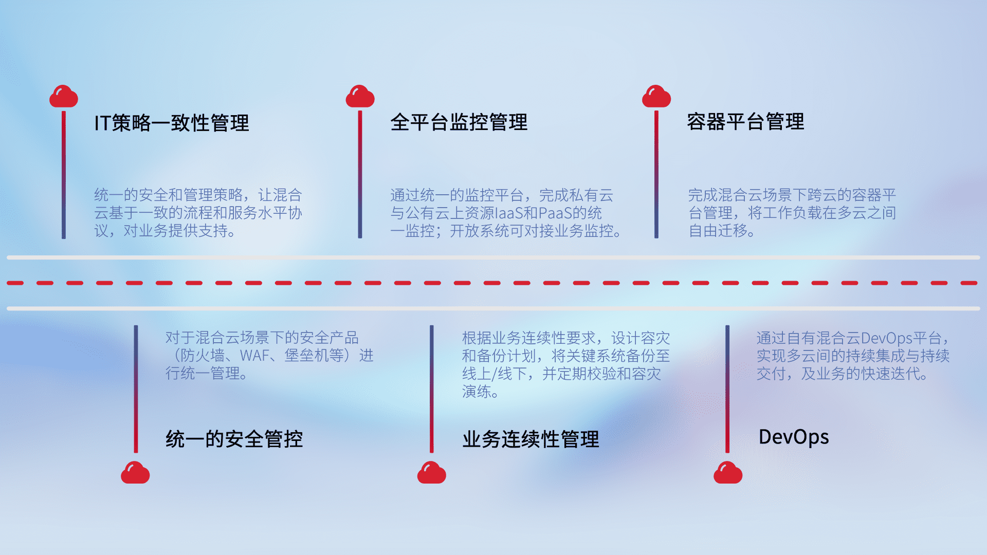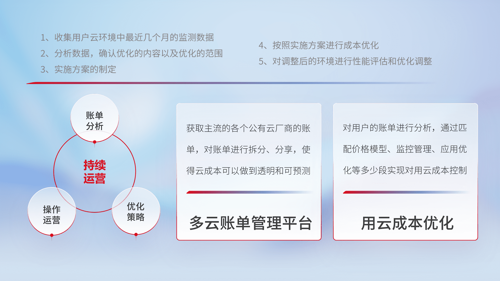 通过多云纳管,,以统一的资源数据模型把客户的云资源进行抽象和封装,,,进而实现对多云资源的统一操作,,,,保障云资源管理的可靠性、、、、稳定性与可用性。。。量身定制化运维内容,,,,配置、、开发运维、、、、补丁管理、、、、备份、、、、监控、、认证和访问管理、、、、审计和日常巡检等,,保障在用云过程中的可靠度,,,,稳定度以及高可用率。。。。
