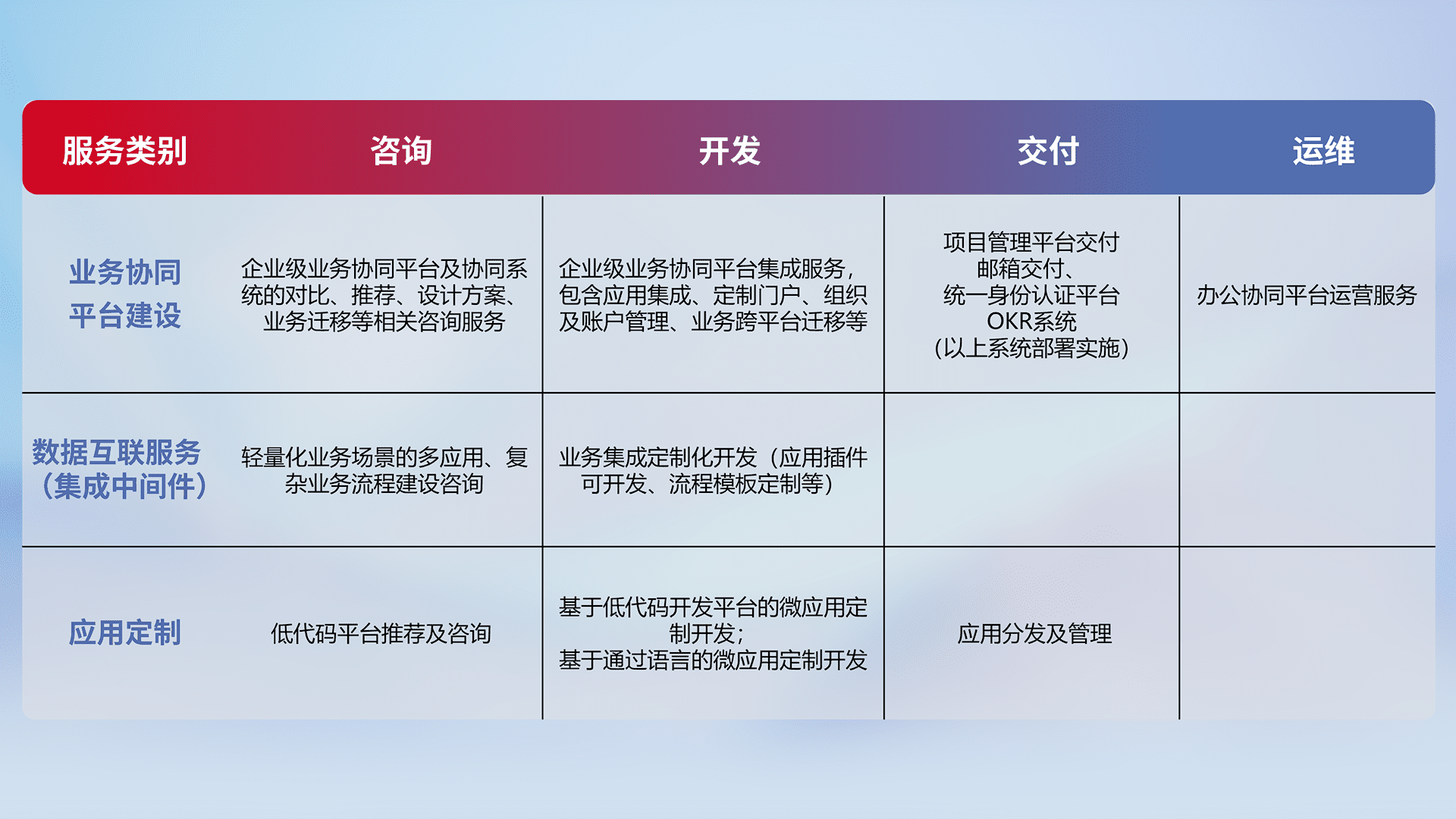 针对钉钉、、企微、、、IDaas等平台级产品提供产品的规划、、方案、、、、交付、、定制化开发等服务,,,,实现如统一协同办公、、、智能客户服务、、、、混合会议管理、、、智能数据查询、、等业务场景,,,实现数字化转型。。。